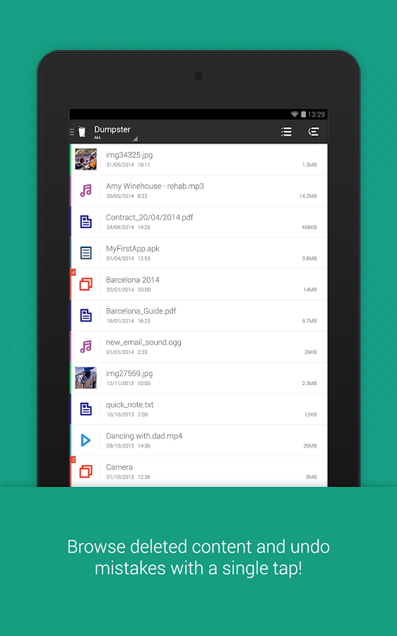 ✔ Restore deleted pictures, music files, videos and pretty much almost any file type (pdf, mp3, doc, avi, mp4, jpg, png, rar, ogg, txt and many more: _http://dumpsterapp.mobi/support.html#file-types)