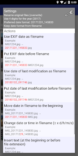 This app aims to rename your photos and videos so that the filenames begin with the date of recording. That way, you can always sort your files chronologically, regardless of recording device and even after they’ve been duplicated or modified.