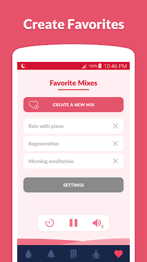 Sleepo brings great collection of HD sounds that can be mixed into the perfect relaxing ambiences. You can choose from different types of rain, nature sounds, city sounds, white noise or instruments. Save your favorite sound mixes so they are always by hand with you.